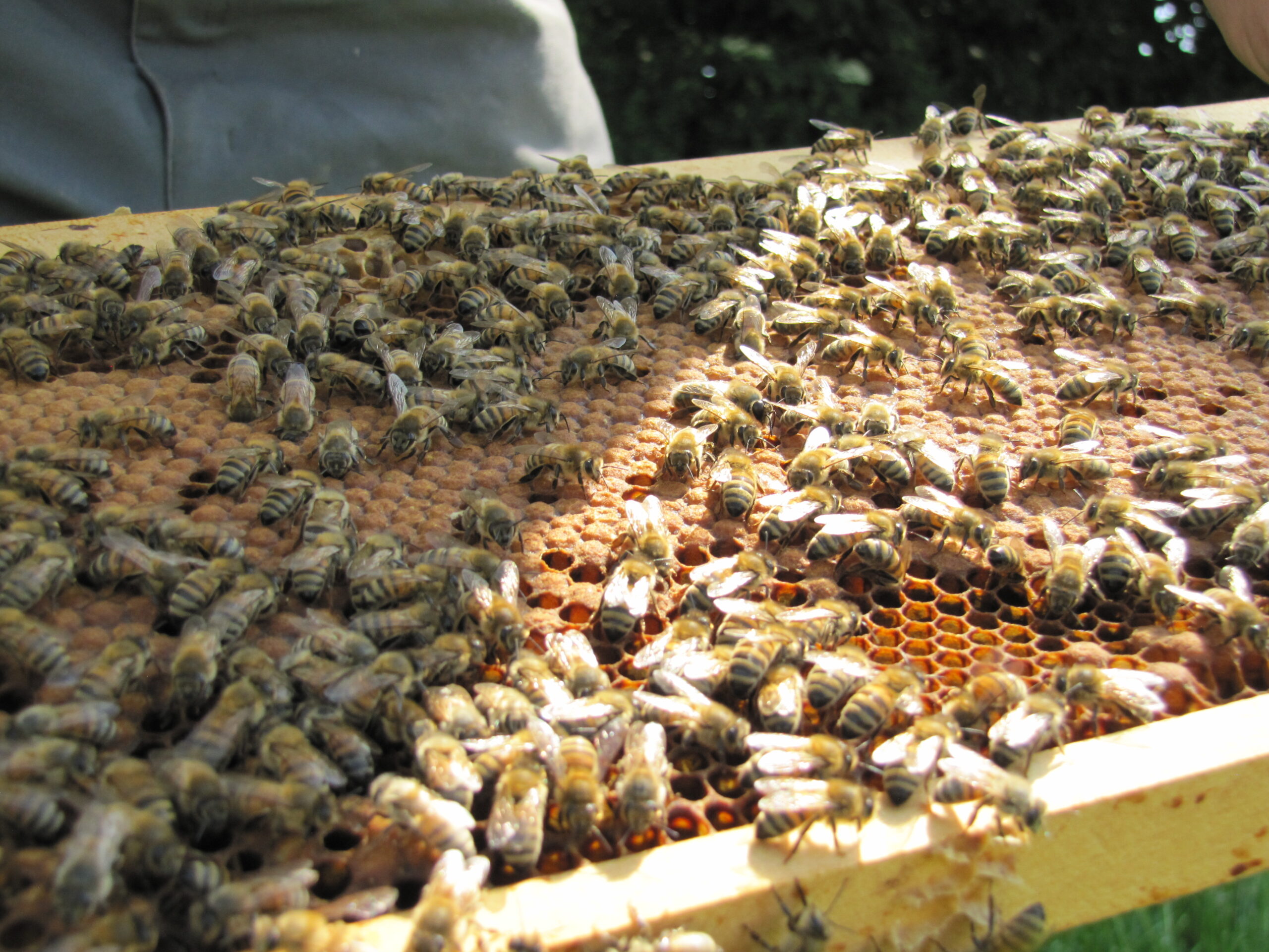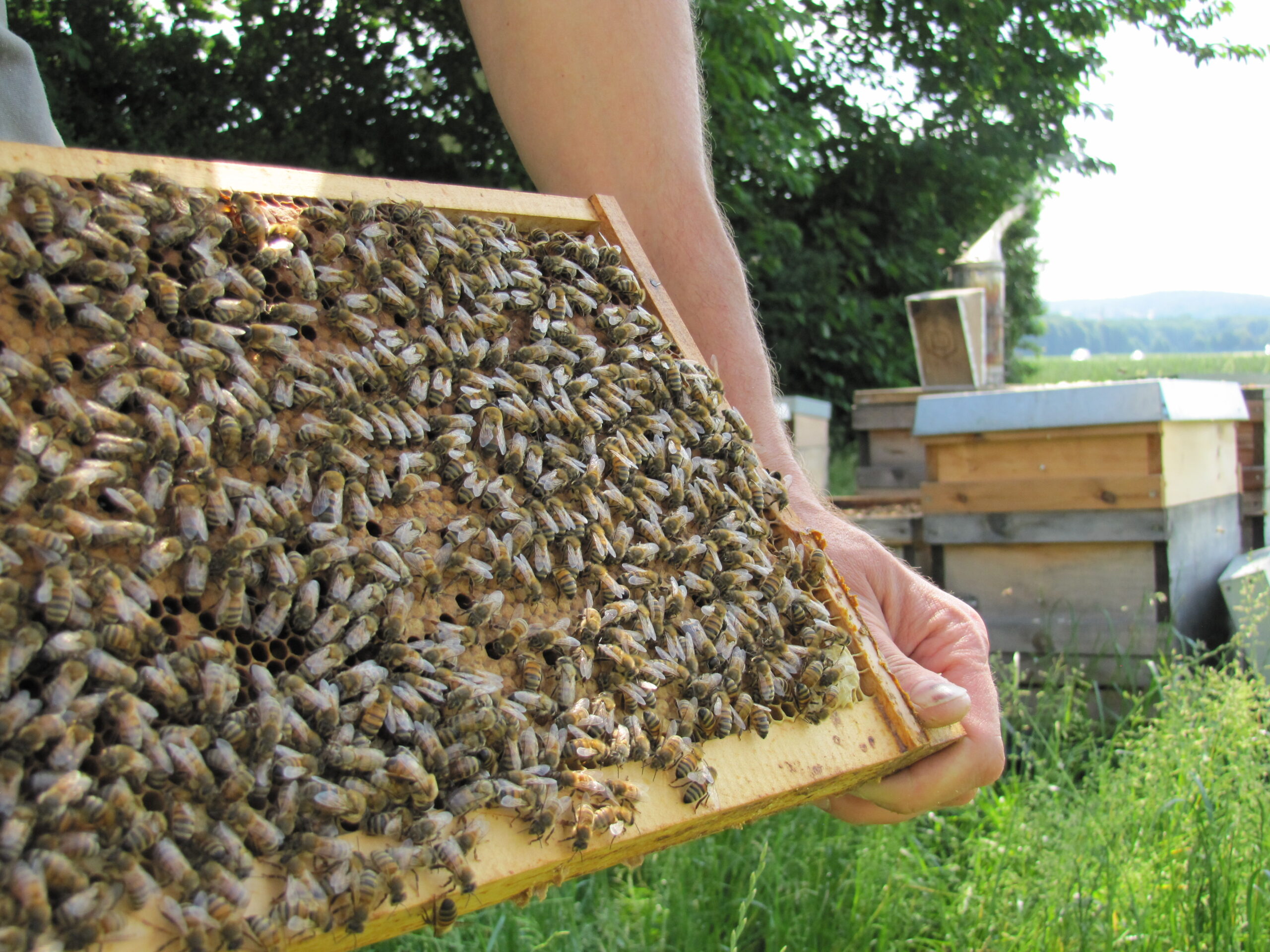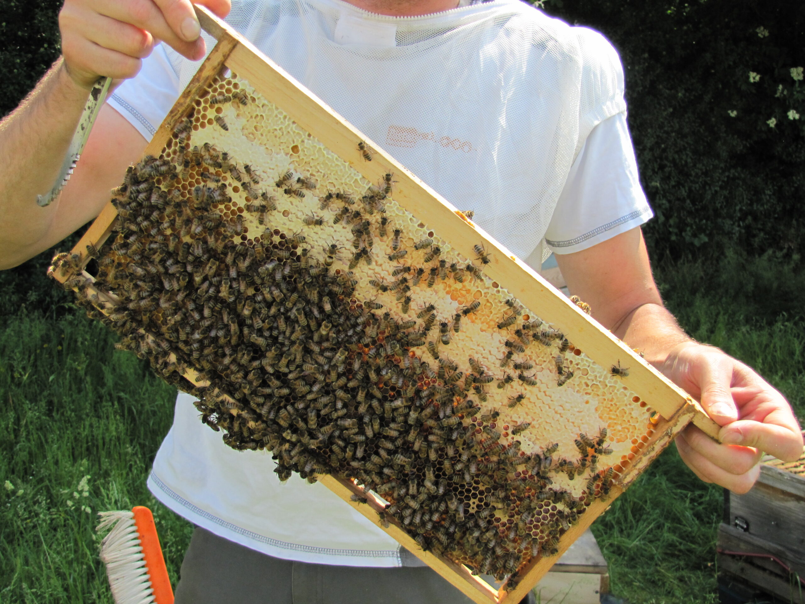 Kim Liza von der Gemüsekiste schaute neulich mal zu, wie man so einen Bienenvolk öffnet. Die Angst verflog dabei relativ schnell, sagte Sie. Die Bienen waren ja auch gut beschäftigt. Draussen werden Nektar und Pollen gesammelt. Drinnen Futtersaft produziert, Waben gereinigt, Honig umgelagert und die Nachkommen gepflegt. Immer wieder spannend! Auch wenn man es schon zig mal gemacht hat…