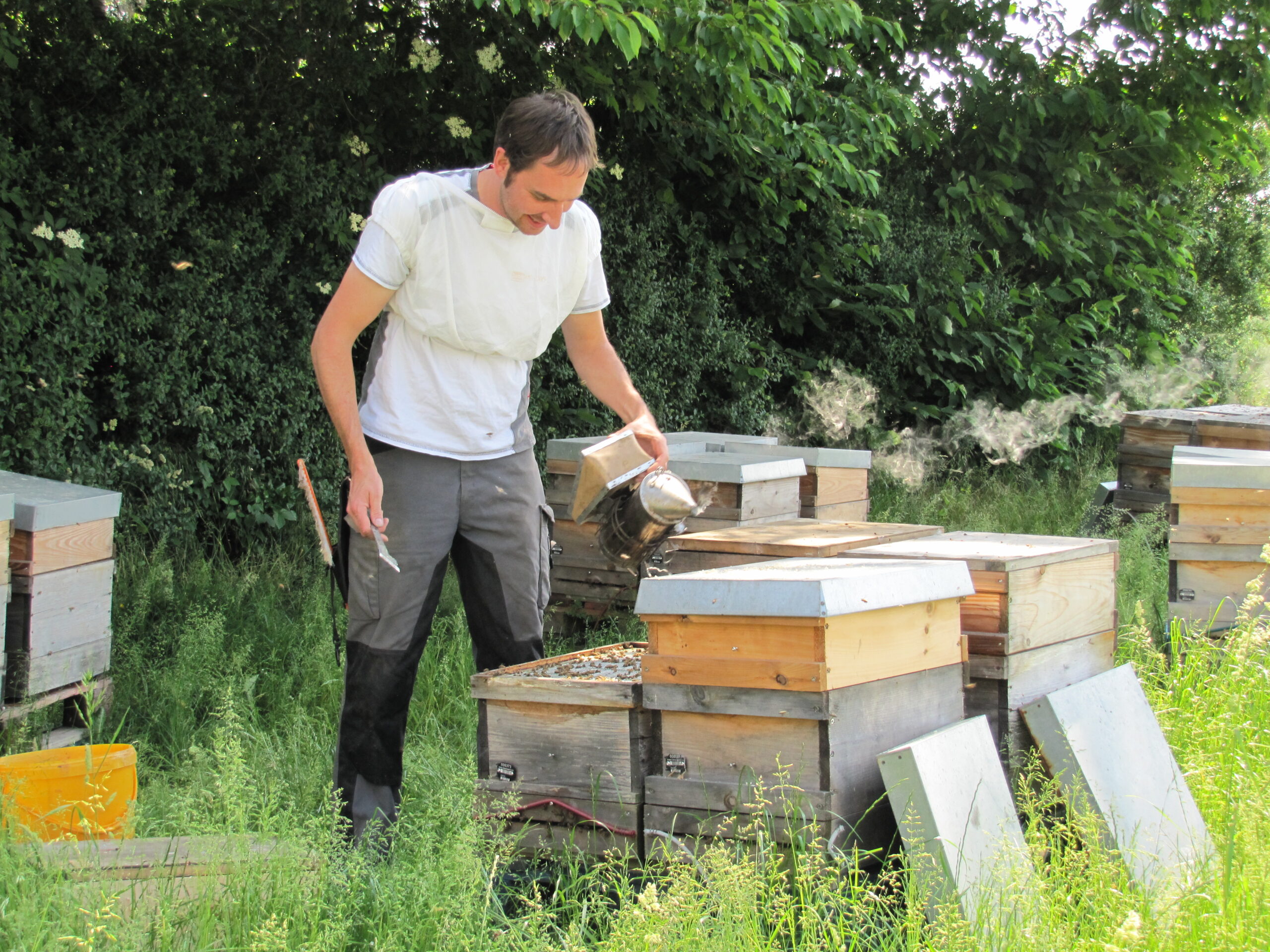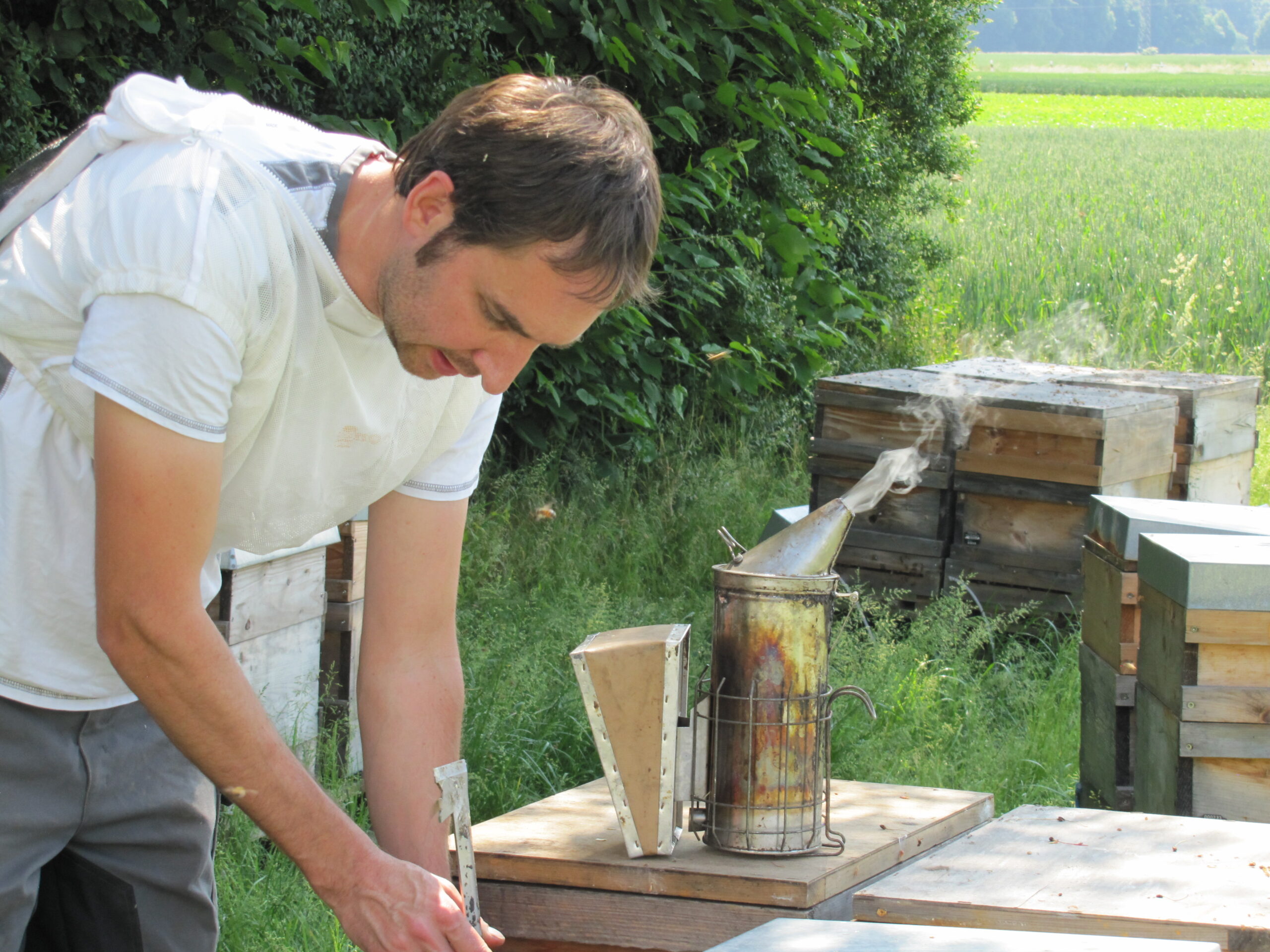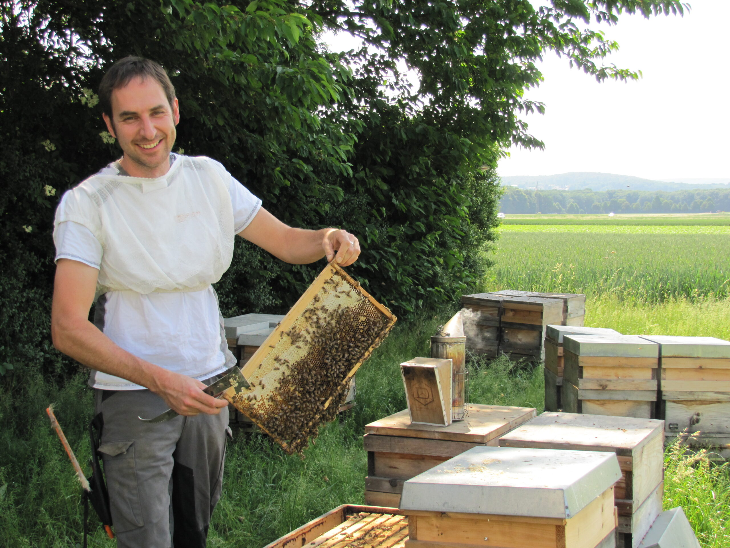 Kim Liza von der Gemüsekiste schaute neulich mal zu, wie man so einen Bienenvolk öffnet. Die Angst verflog dabei relativ schnell, sagte Sie. Die Bienen waren ja auch gut beschäftigt. Draussen werden Nektar und Pollen gesammelt. Drinnen Futtersaft produziert, Waben gereinigt, Honig umgelagert und die Nachkommen gepflegt. Immer wieder spannend! Auch wenn man es schon zig mal gemacht hat…