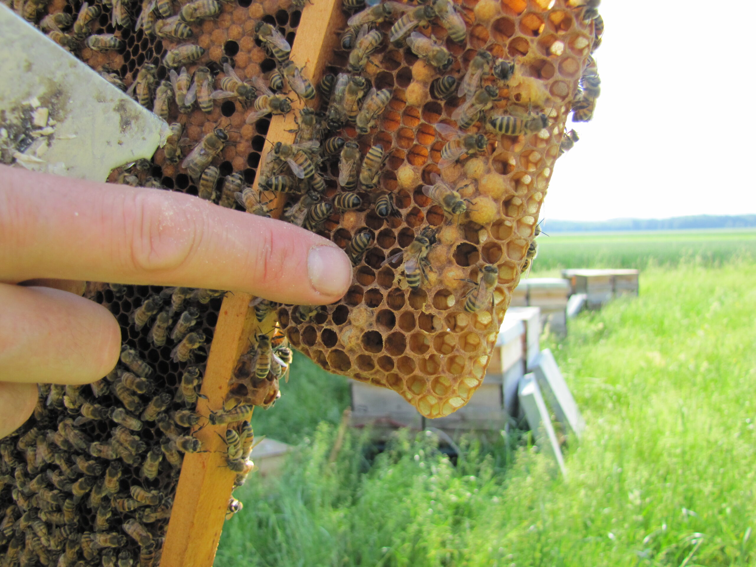 Erfolgreiche Ablegerbildung: Eine Jungkönigin ein Eiablage – die Eier sieht man unten im Bild in den Zellen am Zellboden. Sie werden auch Stifte genannt, wegen der länglichen Form.