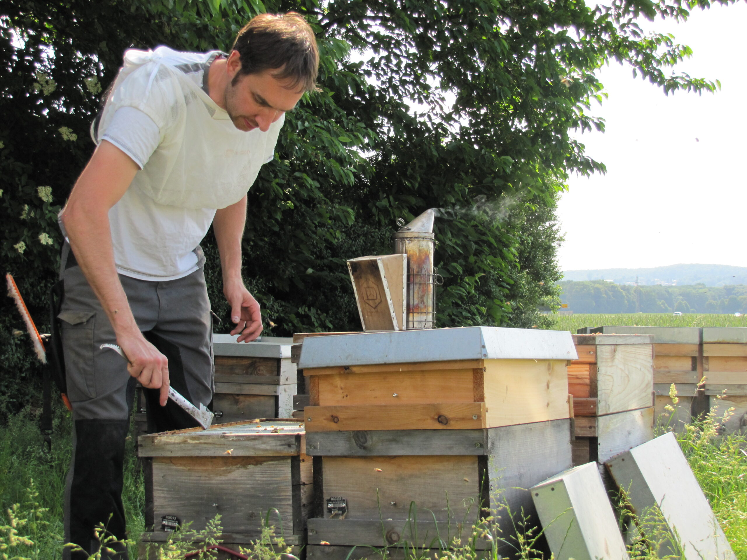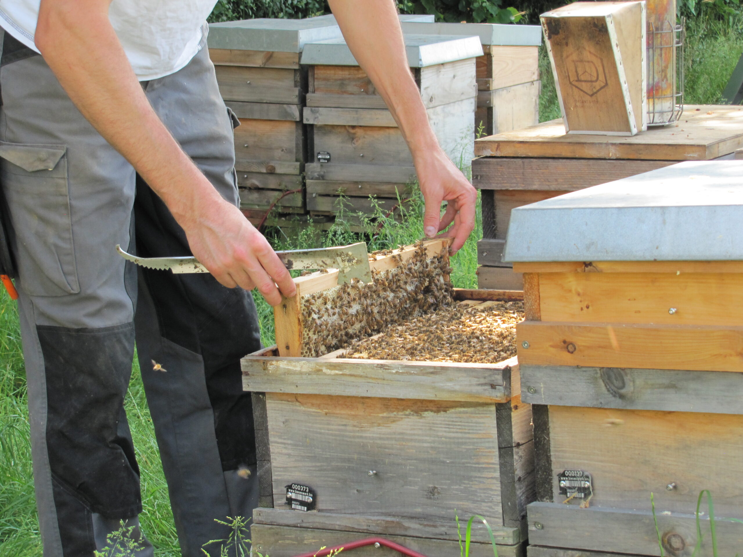 Wichtig zu wissen ist, dass wir in der Bioland-Imkerei die Beuten nicht weiter behandeln. Wir verwenden keine chemischen Anstriche oder auch Leim. So können Sie sich sicher sein, dass diese Mittel auch nicht im Honig zu finden sind. Natürlich werden unsere Beuten etwas schneller grau.